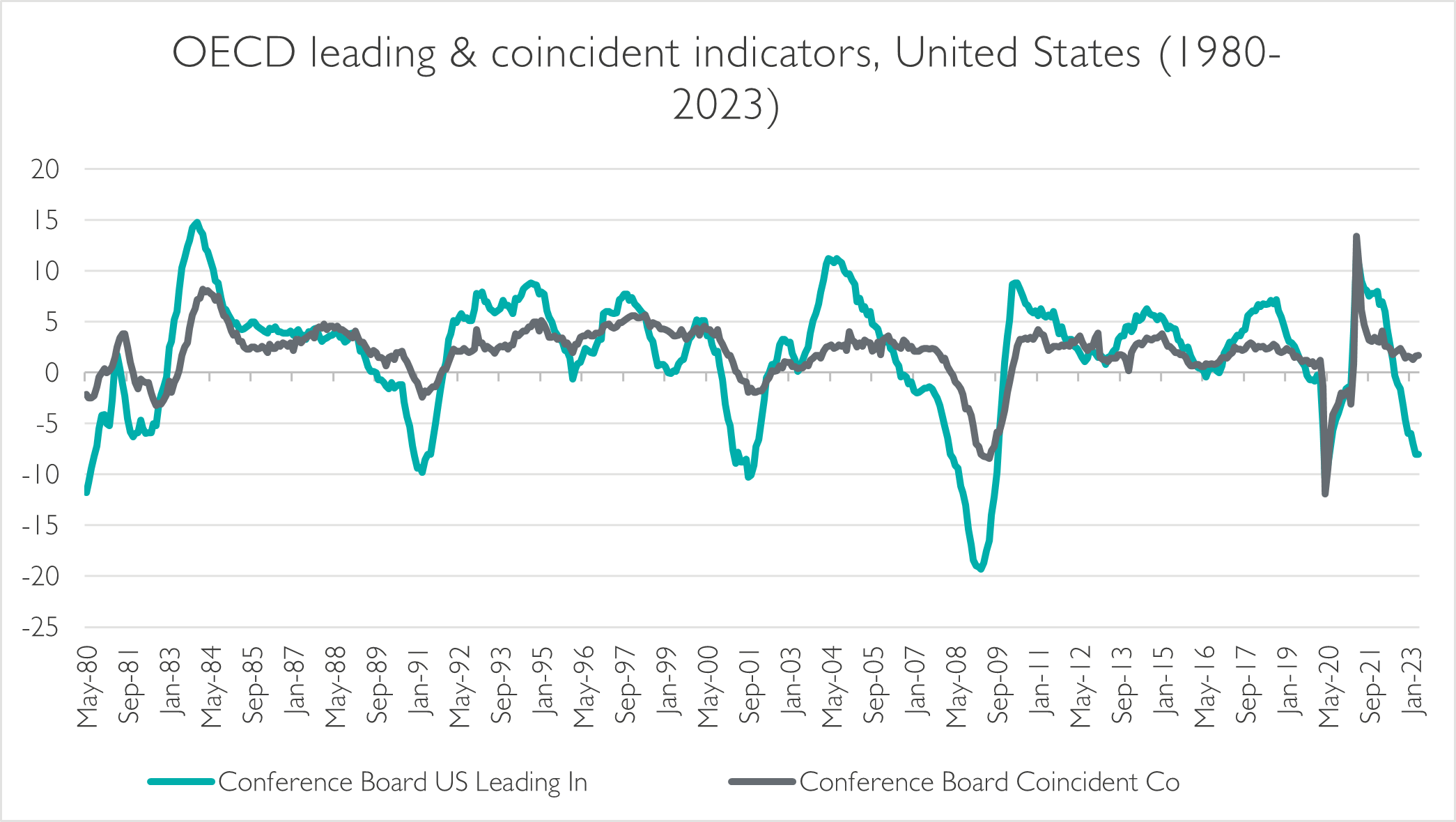 Growth: Early indications of credit contraction are already apparent in economic indicators, exemplified by the latest NFIB survey. This survey reveals a significant rise in interest rates paid, a decline in capital expenditure, and weakened hiring intentions. While global economic growth in Q1 2023 exceeded expectations and the strong momentum of the US economy has led economists to revise their growth forecasts upwards for 2023, we maintain a sceptical stance due to the ongoing deterioration of leading economic indicators, where the percentage change is a level historically associated with an impending recession. Despite the recent positive performance from risk assets, these indicators warrant caution within portfolios and suggest a potential slowdown.